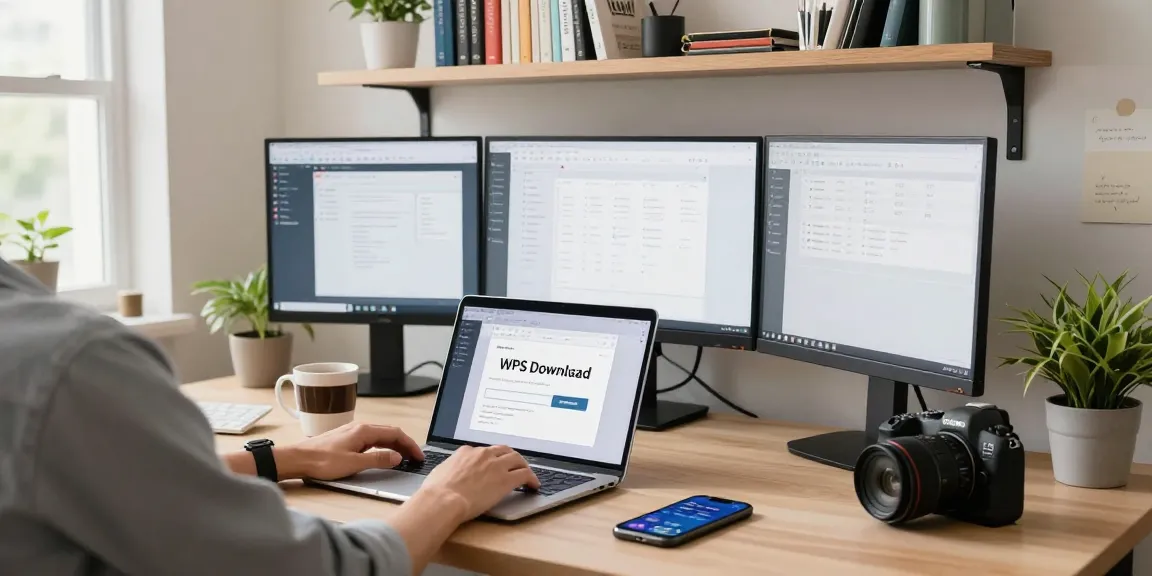WPS Download scene showing a user preparing to download WPS Office in a modern home office setting.